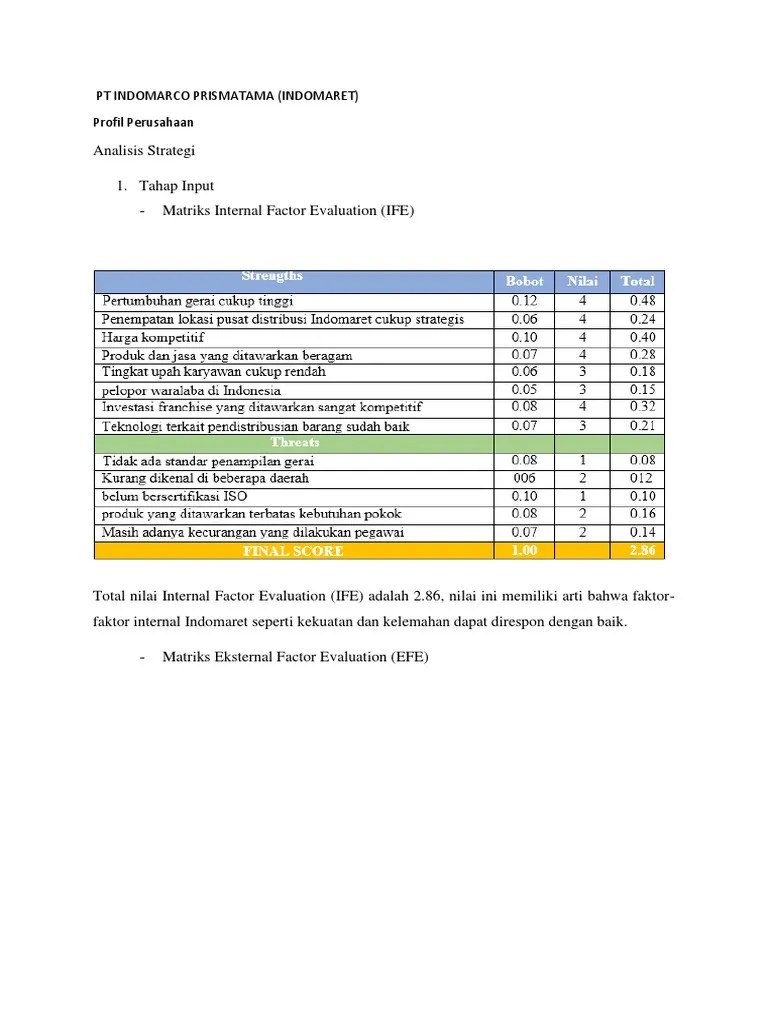 4.1.1.2 matriks ife (internal factor evaluation) perusahaan 71. Matriks efi dan company profile matrix. Data subjektif mengenai profil perusahaan. Adalah matriks profil kompetitif (competitive profile matrix— cpm). Shantika dalam matrik swot berada dalam posisi investasi,.